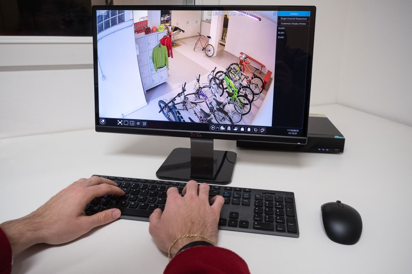 Eine videoüberwachte Garage ist mit Instrumenten für die Reparatur und Reinigung des Fahrrads ausgestattet.